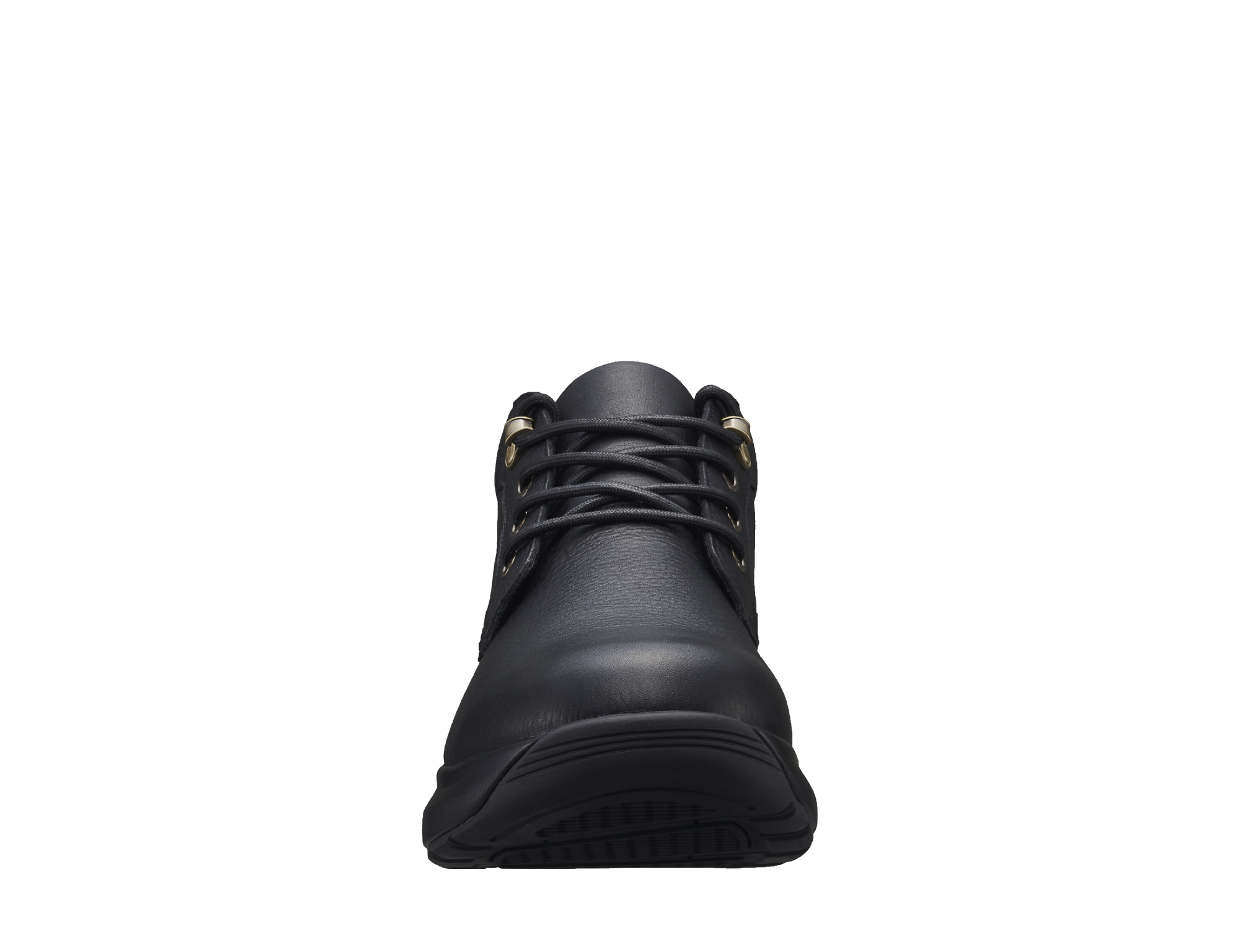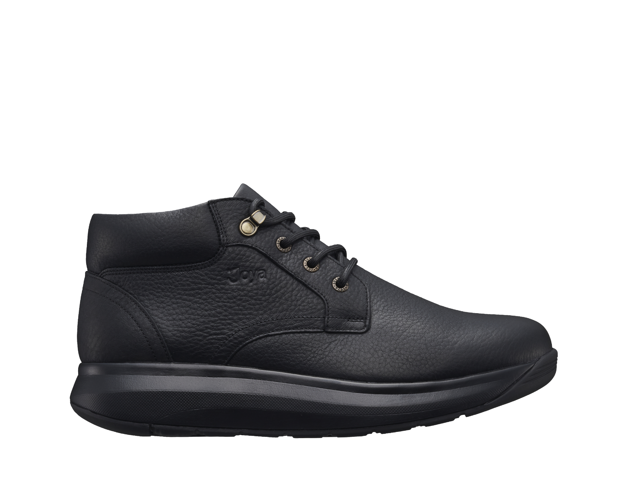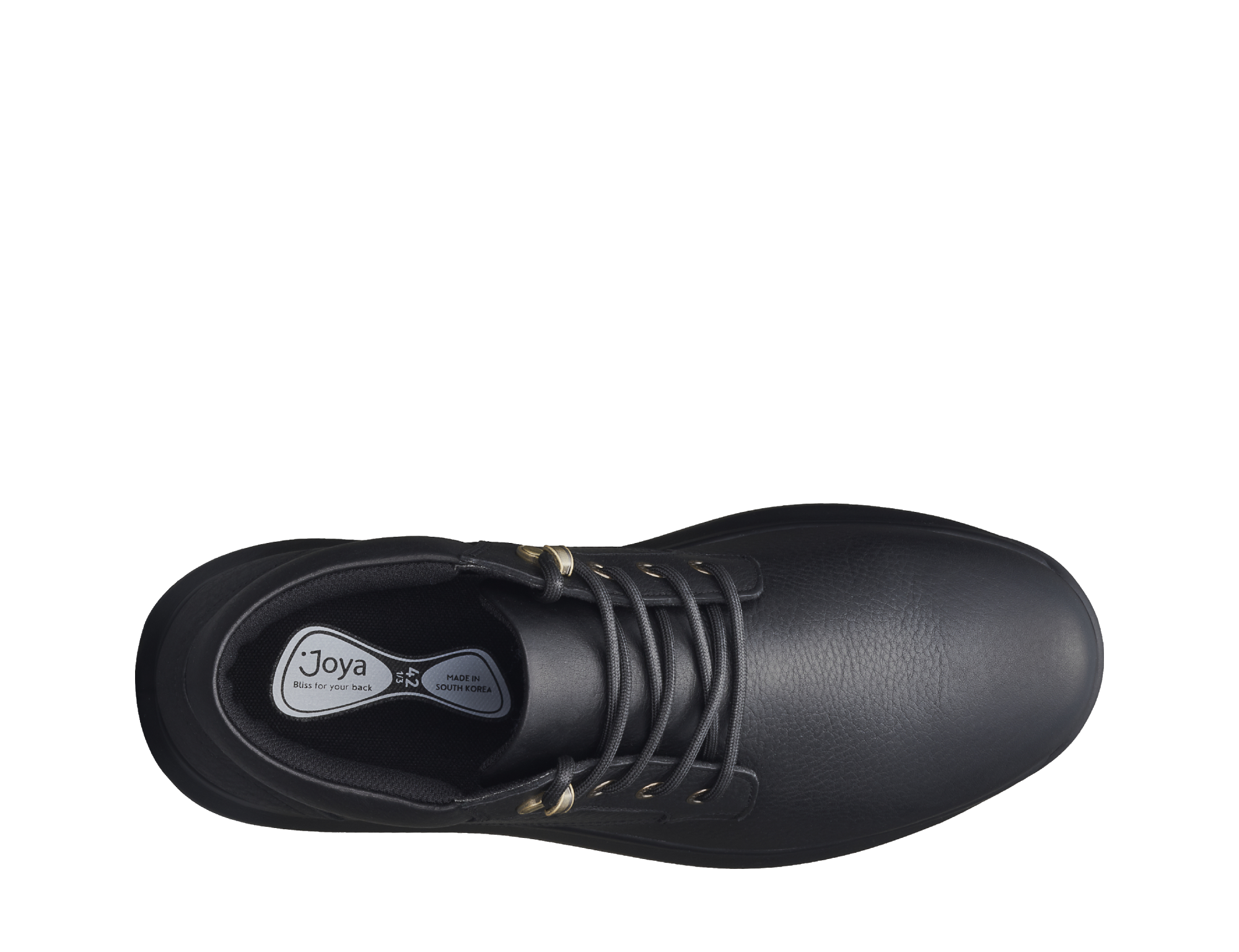 Osaka black: Full grain tumbled leather lace up chukka boot with metal eyelets and top hook. With plain, seamless toe and padded ankle collar for superlative comfort. Featured with the Joya Senso sole technology that ensures excellent cushioning effect and balanced pressure distribution and delivers optimum comfort and relief for your back, joints and feet daily stress.